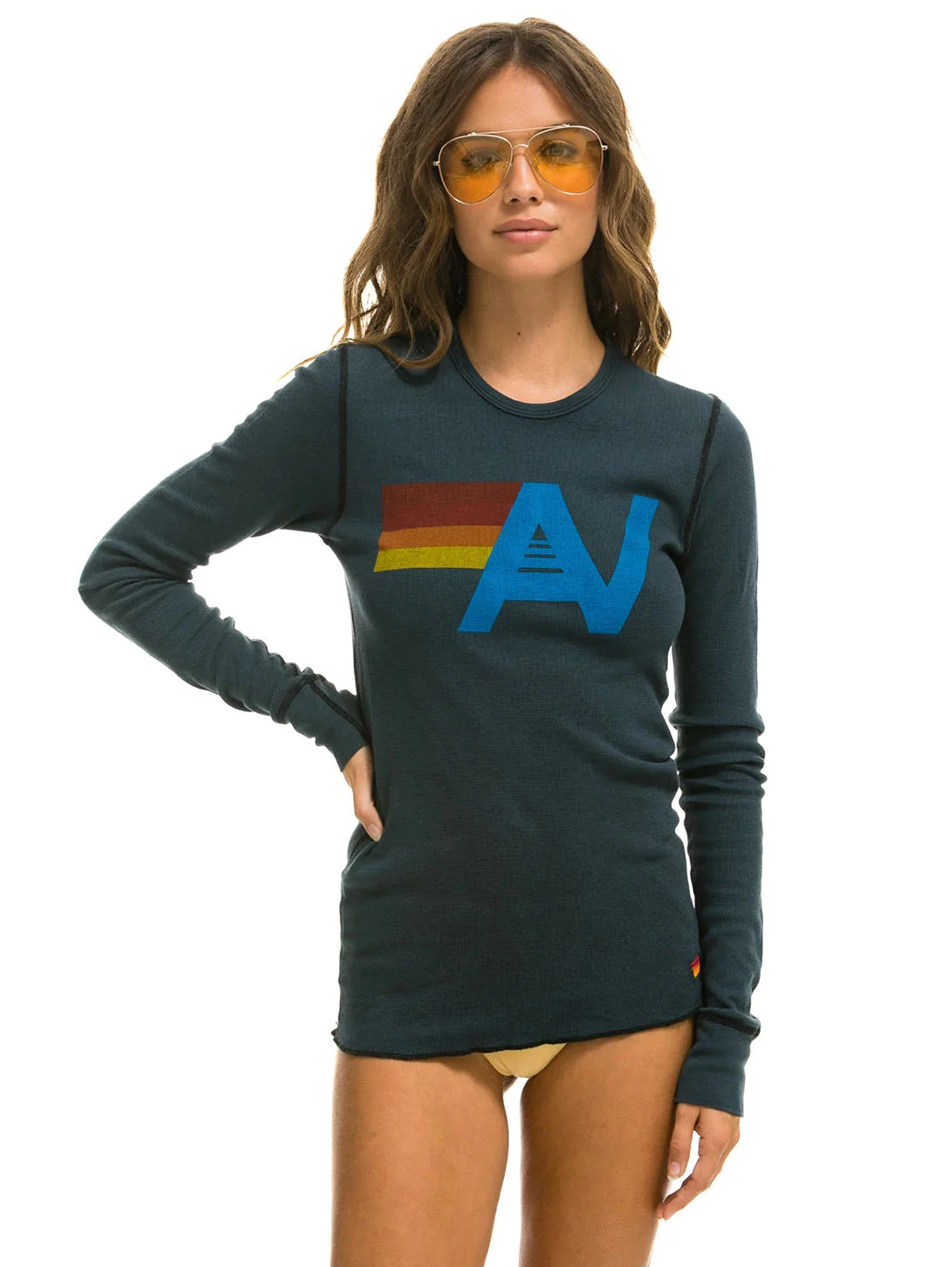 This Aviator Nation thermal is built for warmth and speed! Super soft and effortlessly rad. This long-sleeve top is made from a tri-blend fabric and features a crew neckline and a signature logo graphic on the chest.