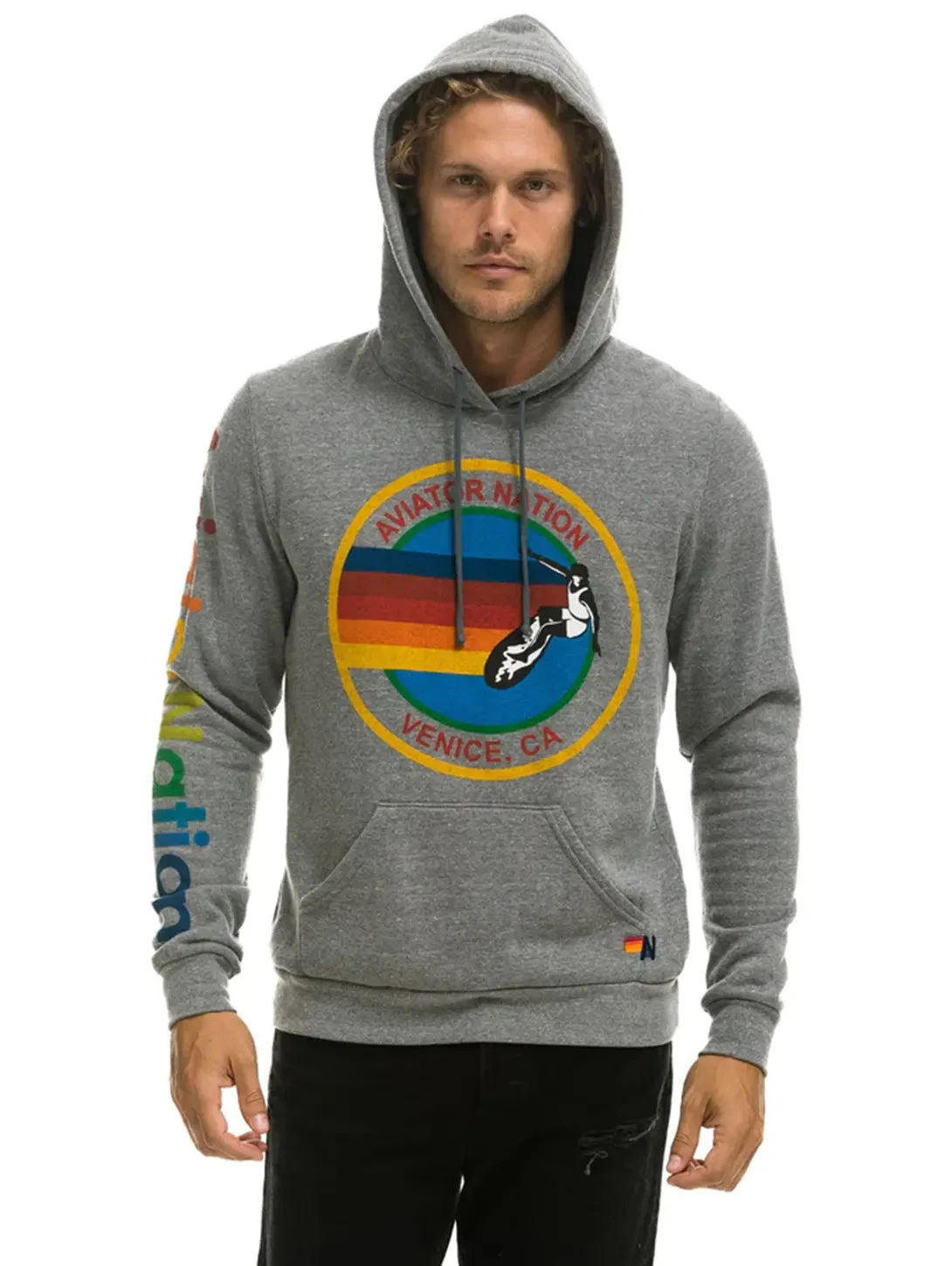 Surf’s up with this hoodie. Made from a tri-blend fabric, this hoodie features a drawstring hood, ribbed edges, a kangaroo pocket, and Aviator Nation graphics on the arm and front.
