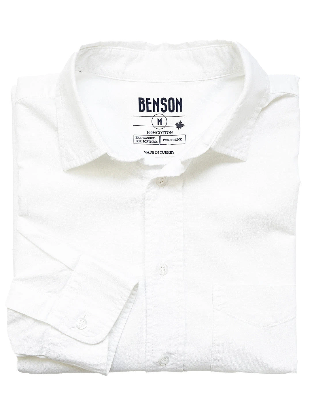 - Front button placket with signature “Benson” logo