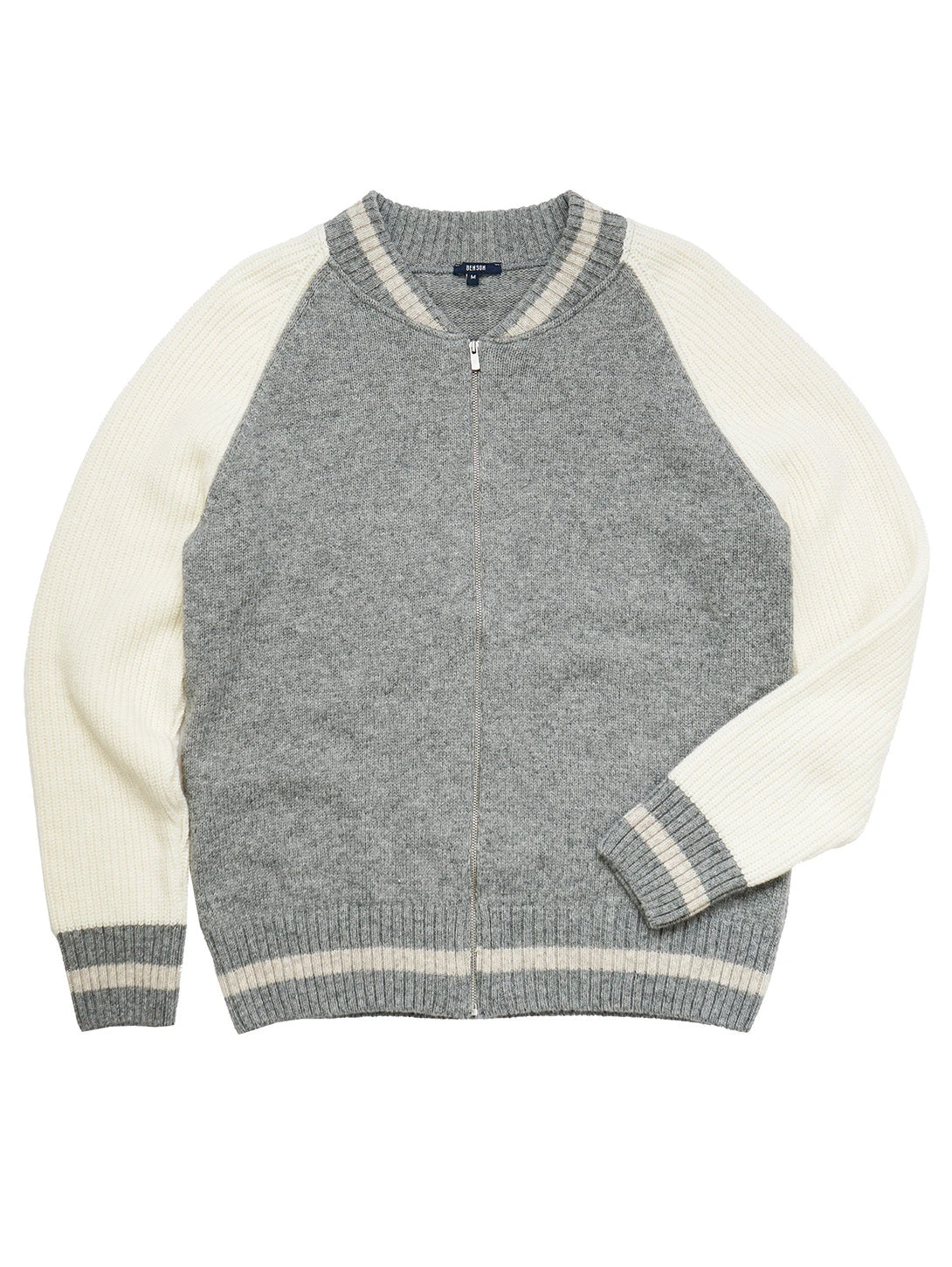 A casual sportswear-inspired bomber cardigan. Made from a wool-blend fabric, wear it over a shirt like a jacket or as a layered piece under a jacket. The contrasting ribbed knit raglan sleeves and striped edges characterize the garment.