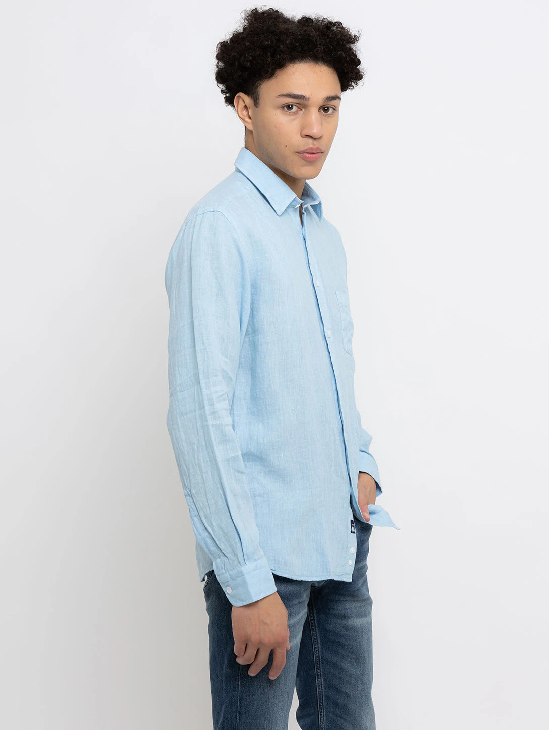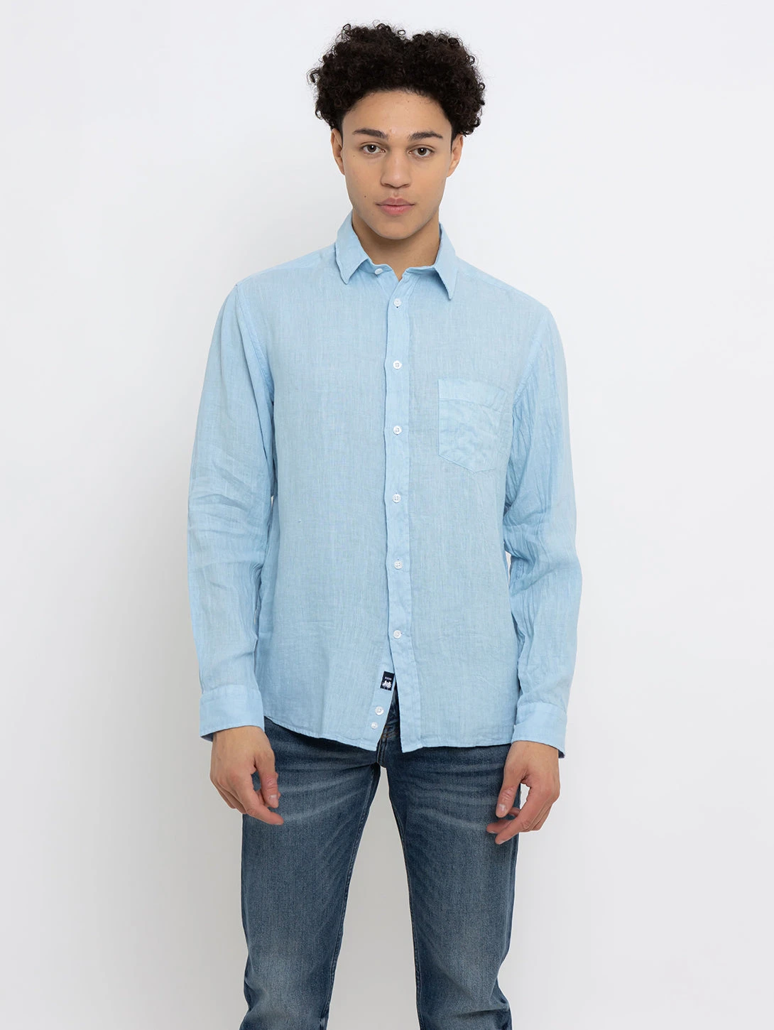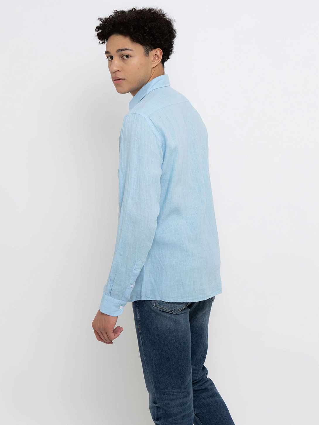 Stay fresh on warm, sunny days in this relaxed classic collar long-sleeve woven cut from light and breathable linen fabric.