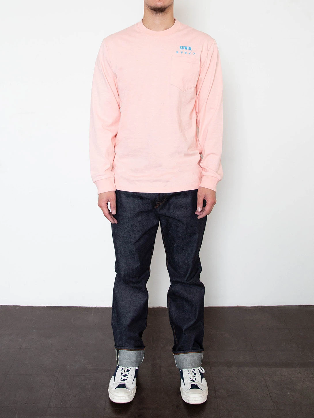 The Edwin Long Sleeve Pocket Tee is sustainably made in the USA from 100% organic cotton. It has a ribbed crew neck and sleeve cuff with a screen-printed front.