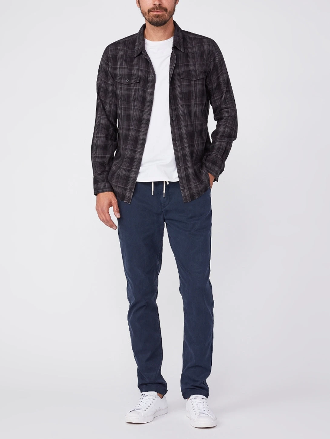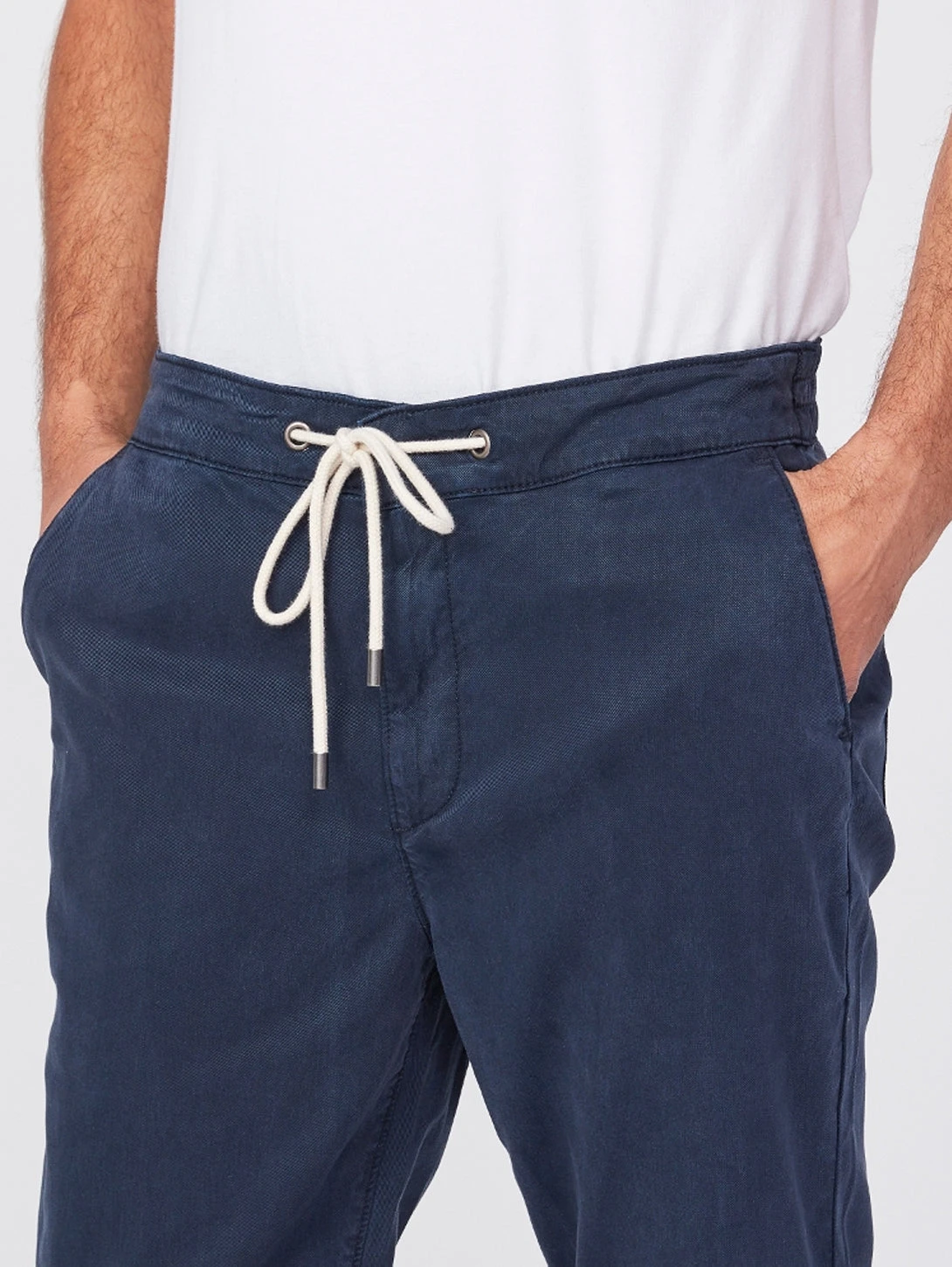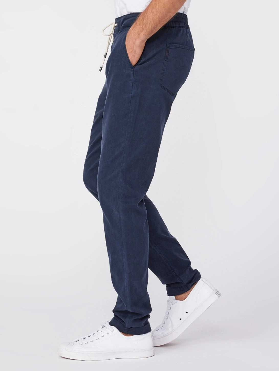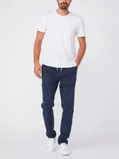 This cuffed jogger pant has a drawstring waist with button closure and a hidden elastic waistband for ultimate comfort. It is crafted in super-soft brushed twill with comfort stretch in a classic navy hue.