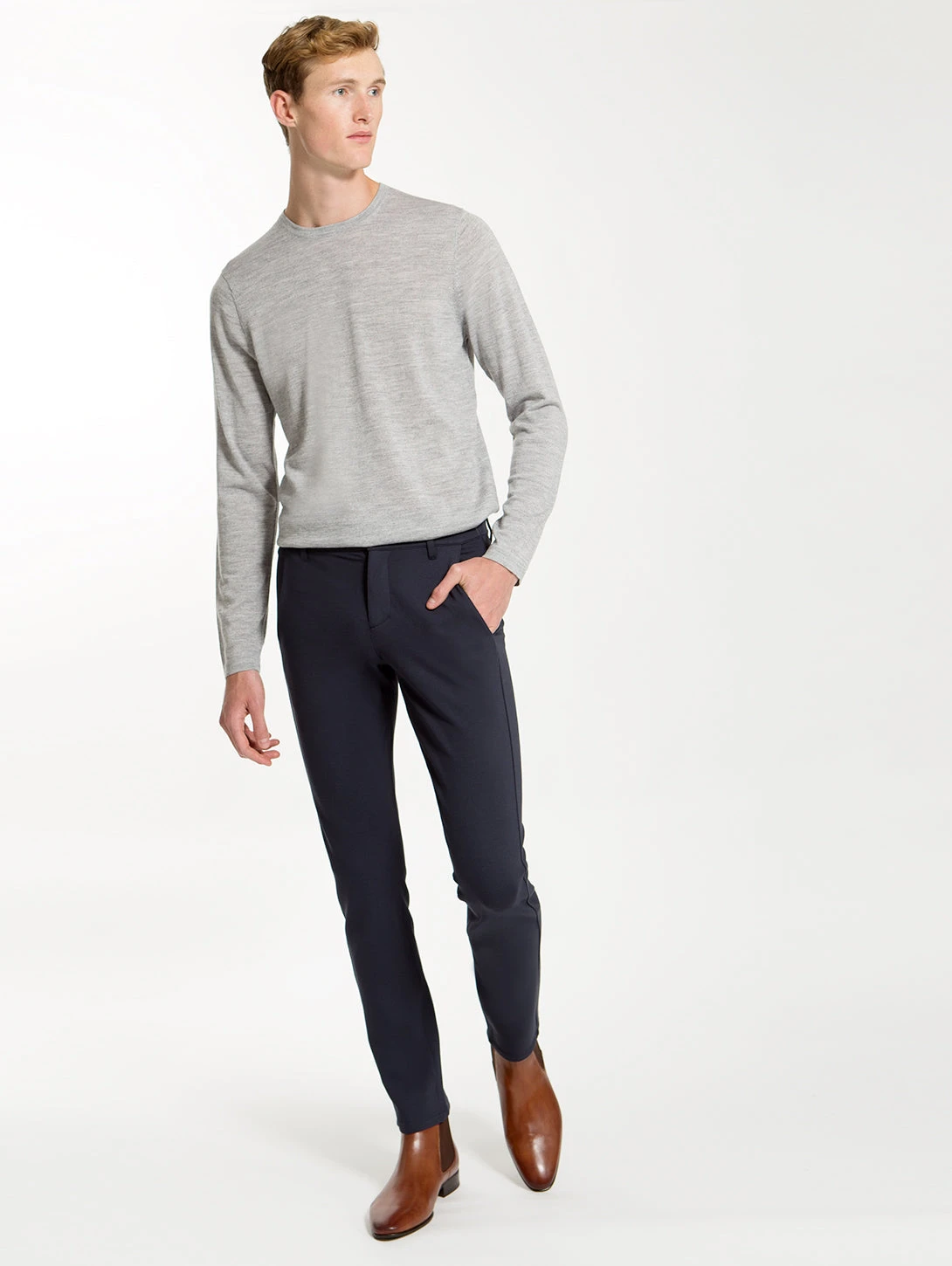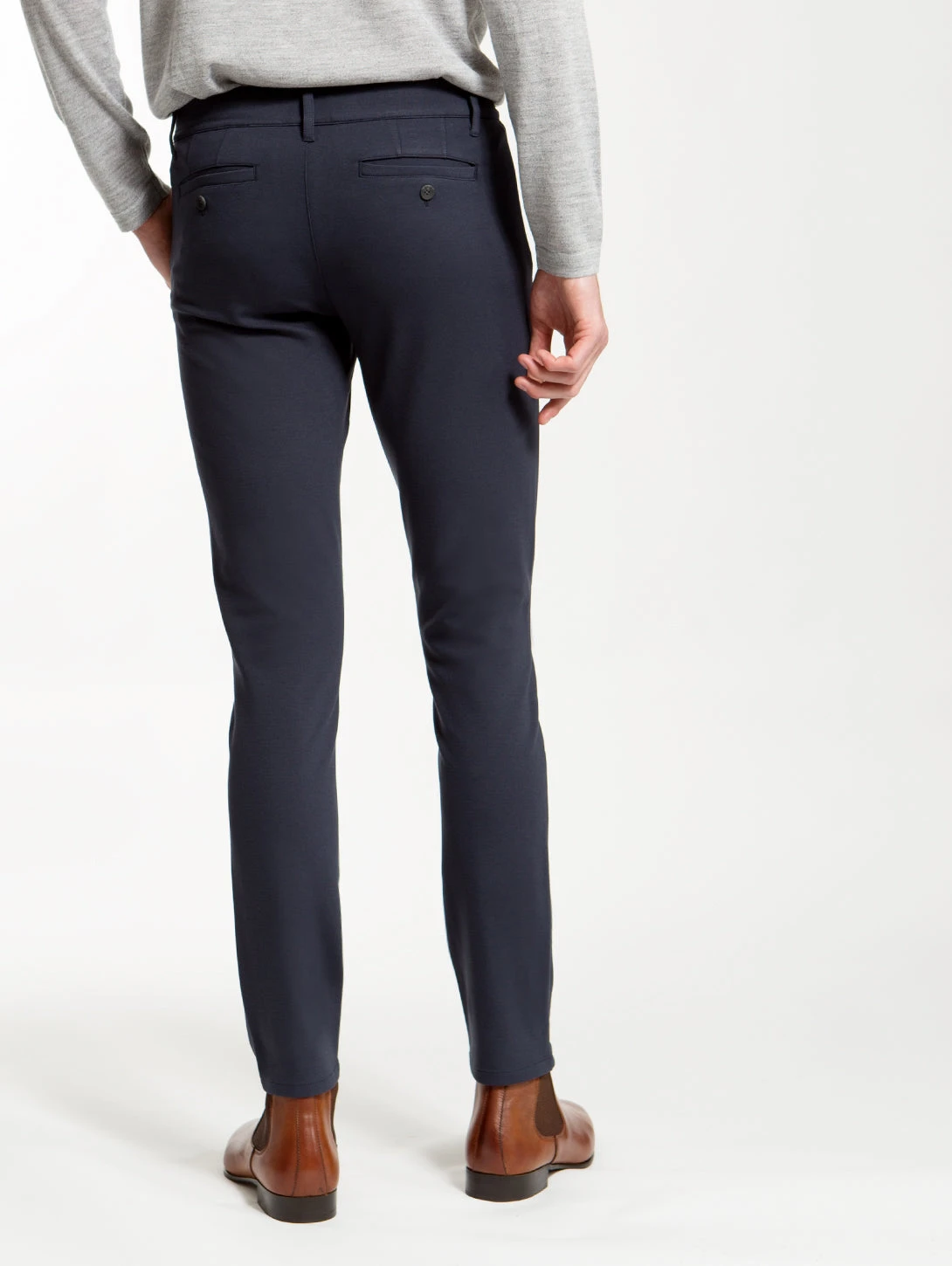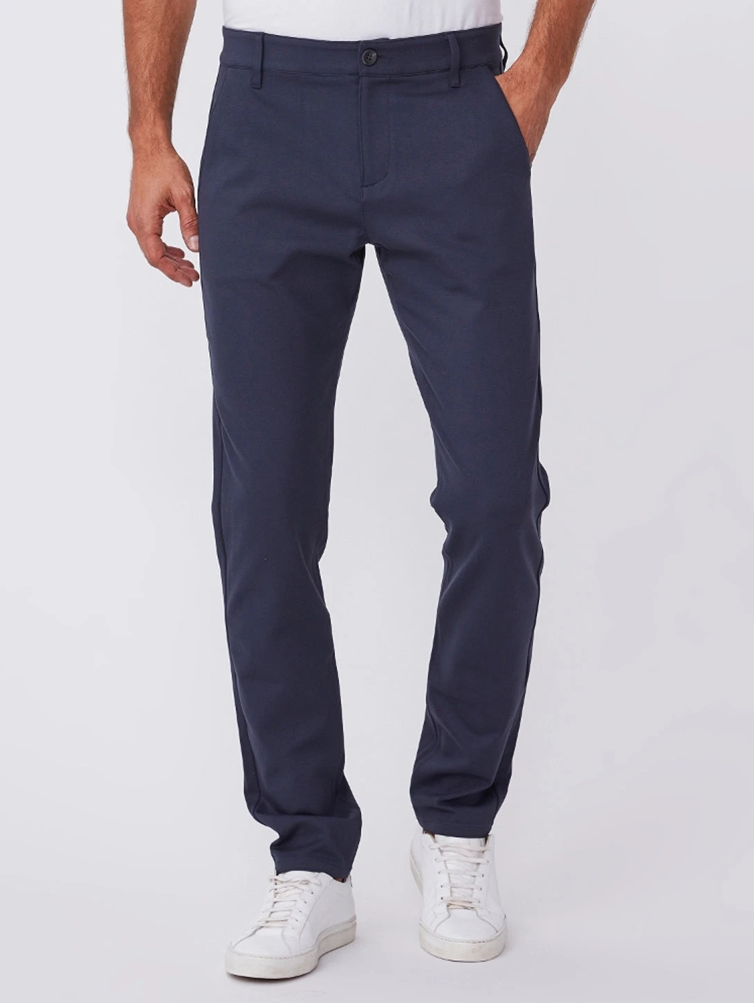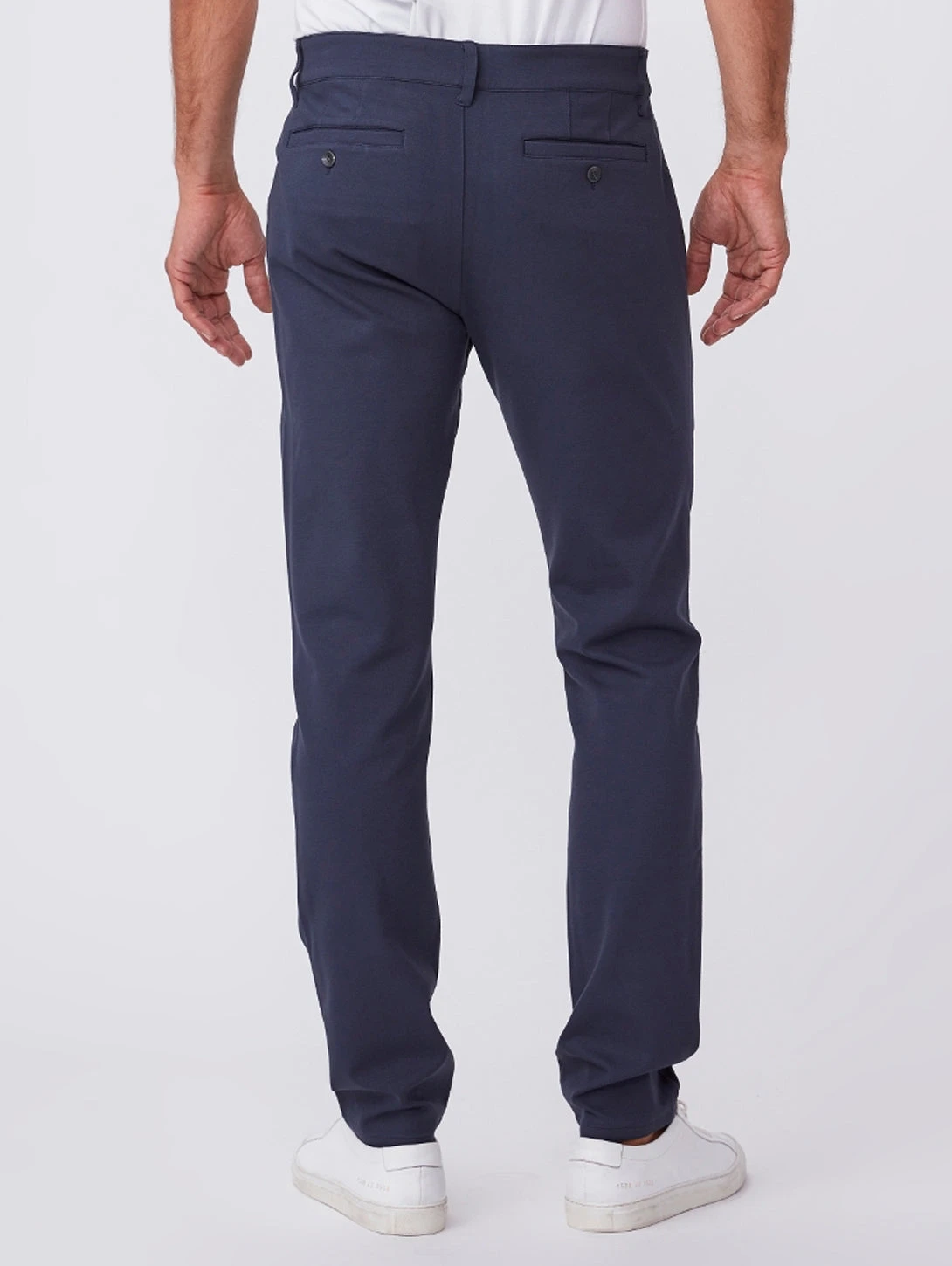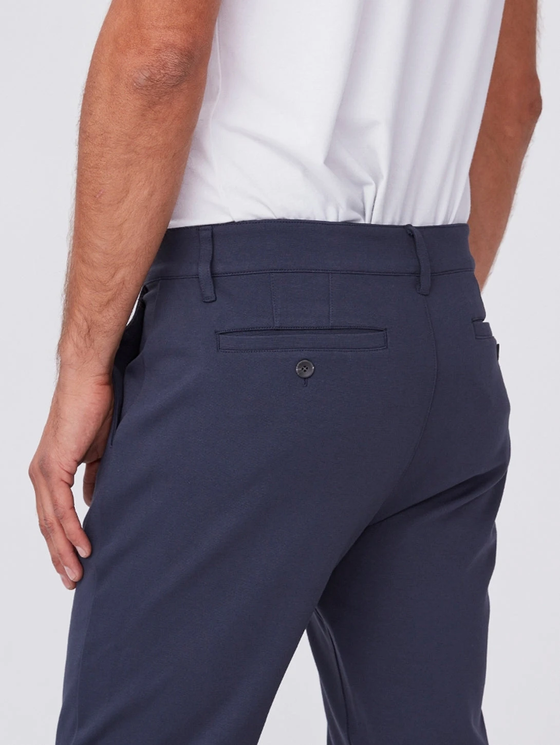This pant is made from a transcend knit fabric in a dark blue wash. It features a slim fit and a high rise.