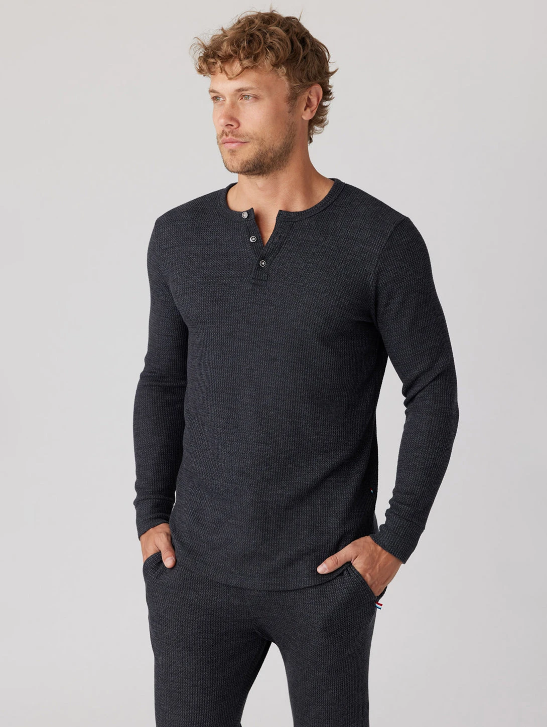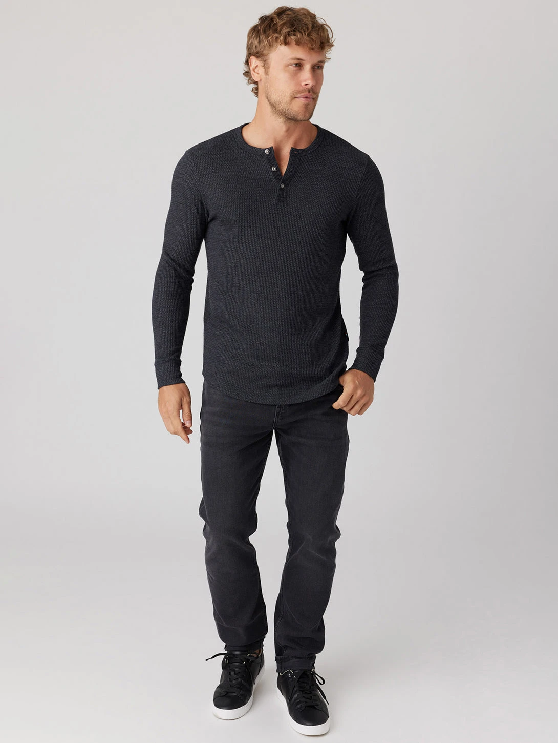 Enjoy the perfect balance of comfort and style with our luxe waffle henley in black. This top features long sleeves, a crew neck, and a 3-button henley closure complete with vintage Sol buttons. The thermal waffle knit of this top is not only aesthetically pleasing but also provides superior breathability and insulation.